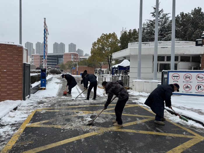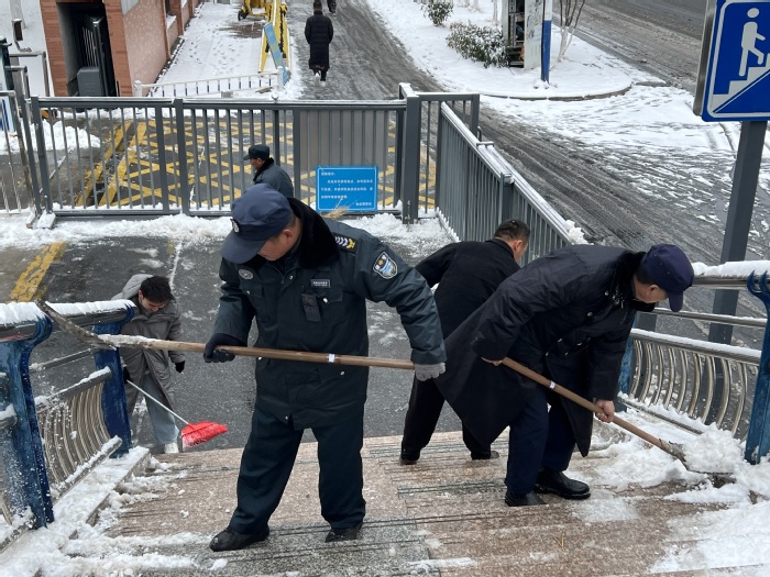 1月20日清晨,气温骤降,雪花纷飞。安全管理处迅速组织人员,手持铁锹、扫帚等工具,奔赴校门、人行天桥及校园主干道等重点区域,开展除雪工作。大家齐心协力,不畏严寒,及时清除路面积雪,有效保障了师生出行安全。